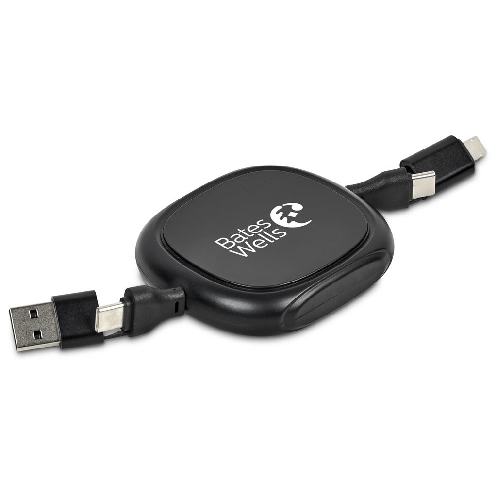 Keep things neat and tidy with this retractable charging cable, which features data transfer functionality. The one side of the cable has both USB-A and Type-C connectors, and the other has a Type-C and a dual Micro & Lightning connector. Pull the cables out to extend and lock them to the length you require, up to a maximum of 90cm. When you’re done, simply give both sides a tug, and the cables will retract back into the housing.