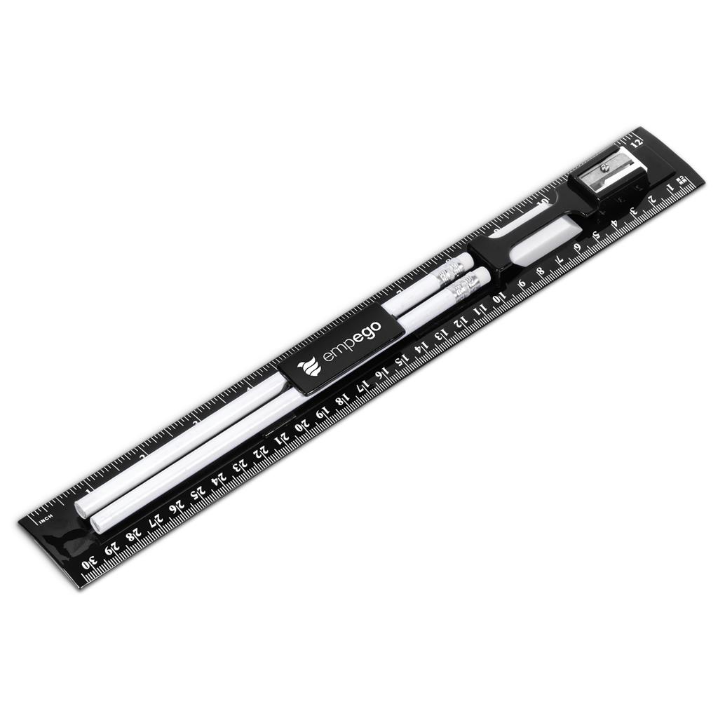 This clever and compact stationery set features a 30cm ruler with 2 pencils, an eraser and a sharpener.